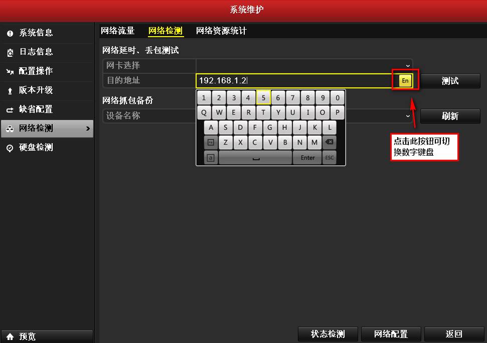 上述兩步如果都嘗試了,還是不行,可能是網(wǎng)絡本身傳輸就有問題,建議進入主菜單-系統(tǒng)維護-網(wǎng)絡檢測-網(wǎng)絡檢測-目的地址內,輸入攝像機的IPV4地址測試,看是否有丟包延時現(xiàn)象。